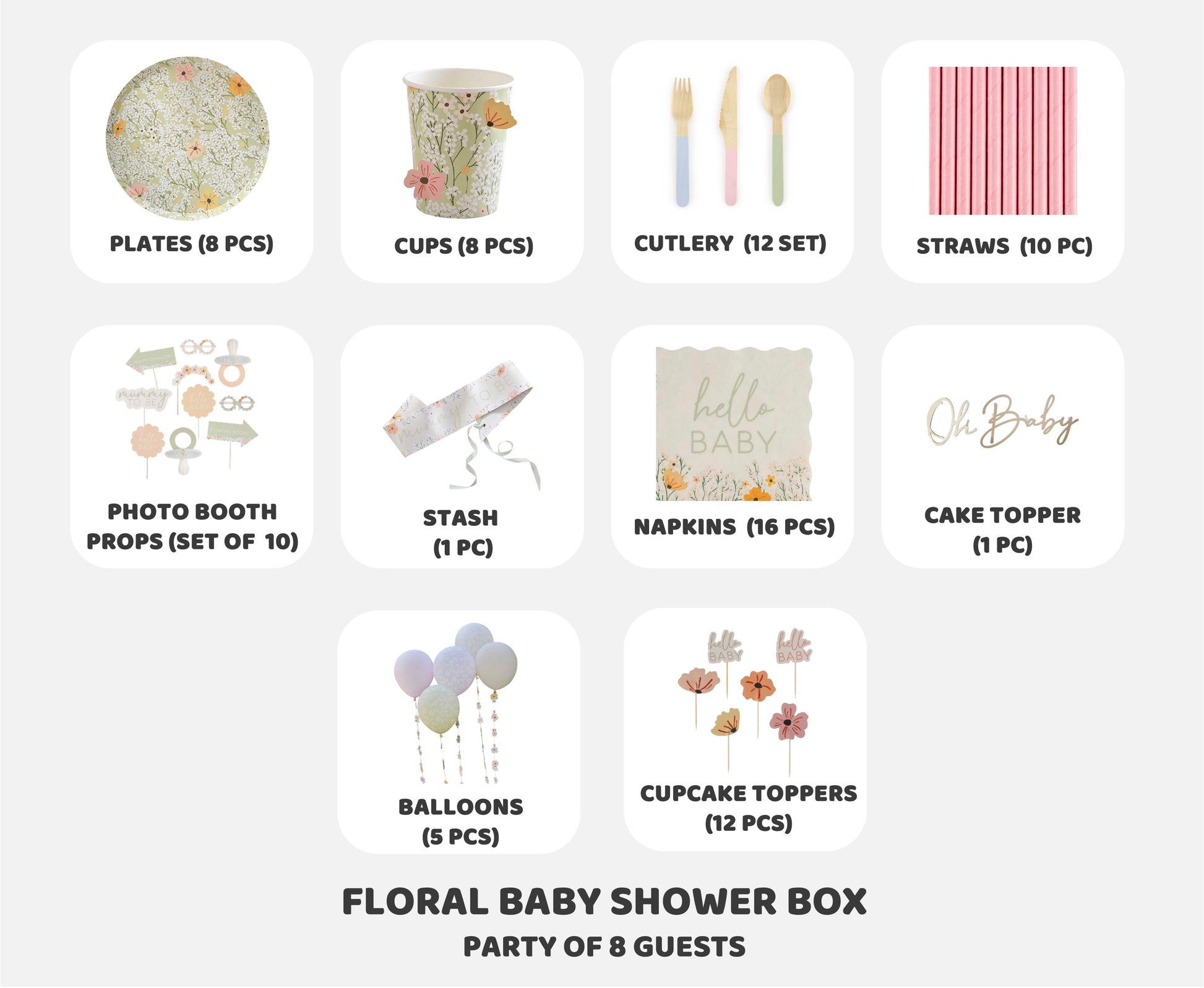 This box is perfect for 8 guests but don't worry if you're having more people at your party! Simply check out our FLORAL BABY SHOWER Collection and add anything extra you might need!