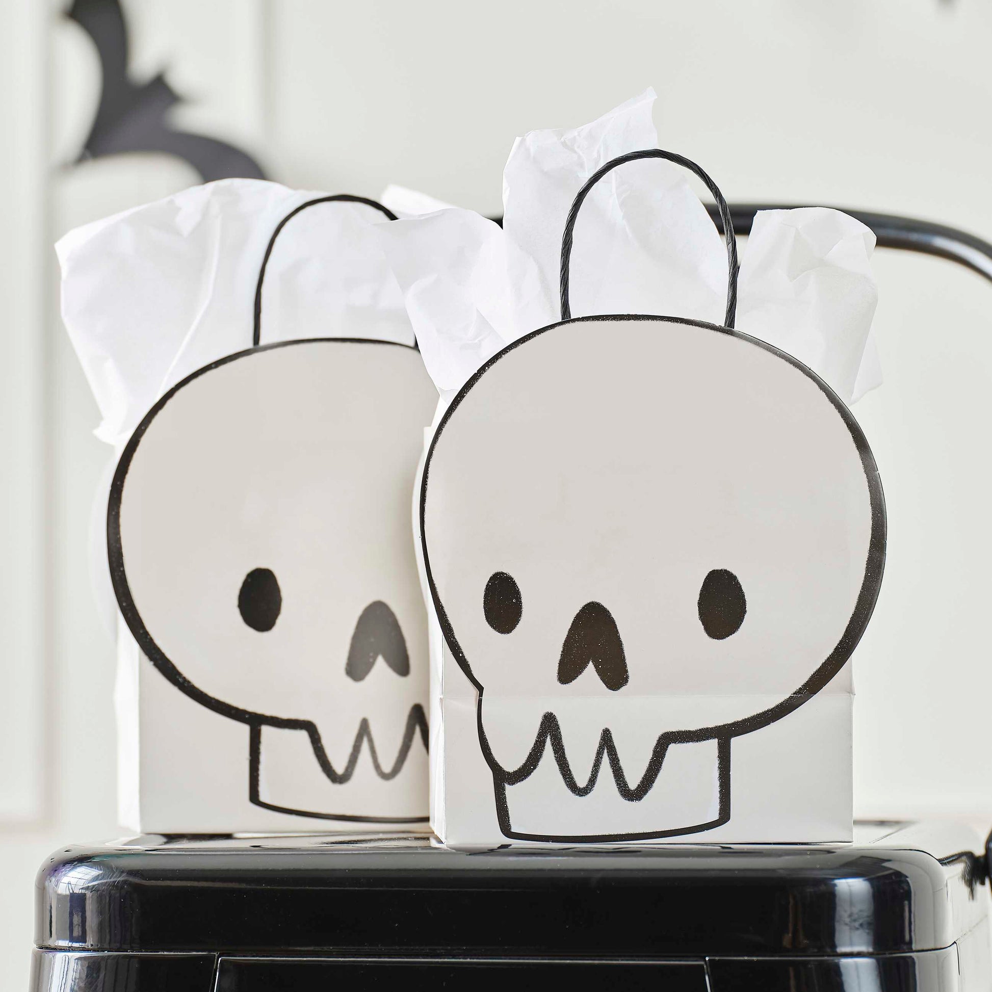 - 6 x White skull shaped party bags with black handles, measuring 13.6cm (W) x 5cm (D) x 14cm (H). Handle measures 9cm.