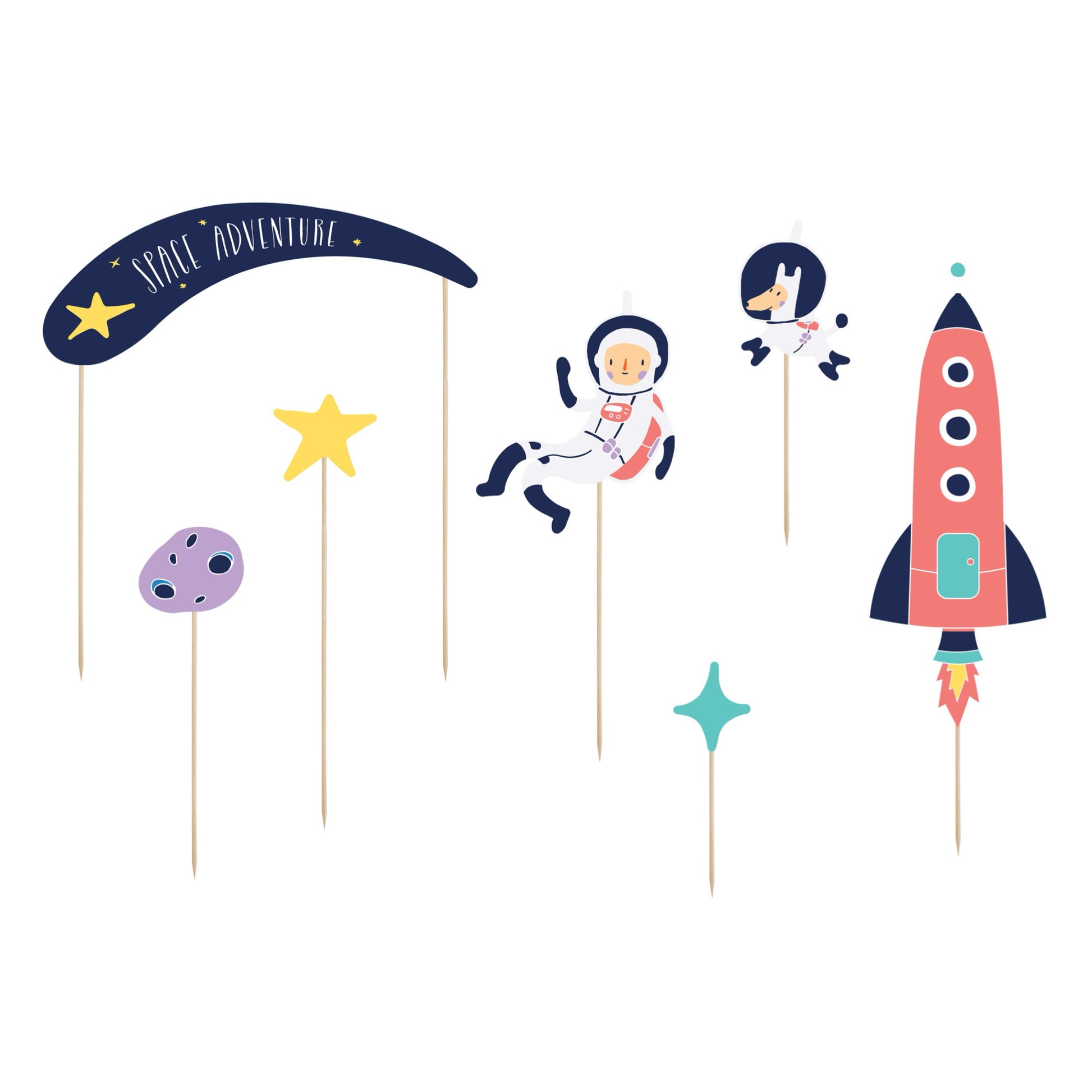 Blast off into space with these awesome space cake toppers. Featuring a rocket, astronaut, astrodog, stars, planet and "space adventure" shooting star banner.